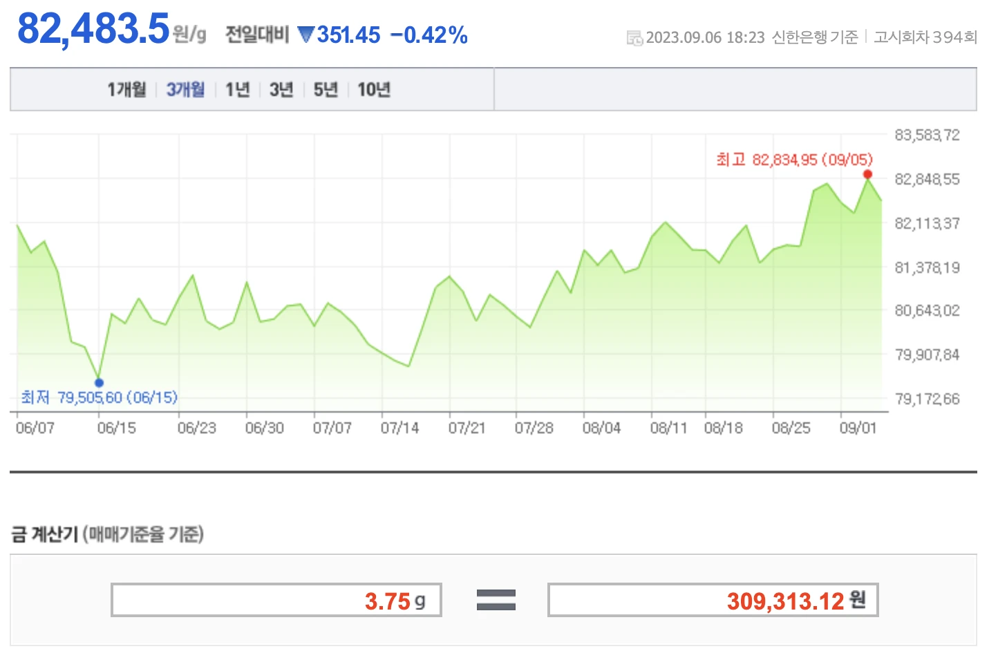 2023년 9월 7일 목요일 금 시세는 약 82,483 원 (실시간 변동)으로 금 1돈 가격은 309,313 원입니다.