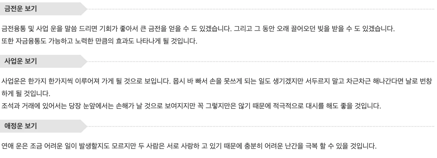 본 글은 띠별 운세와, 생년월일 운세를 다루고 있습니다. 더 자세한 운세를 무료로 확인하고 싶다면 무료 운세 사이트를 방문하여 확인하시길 바랍니다.